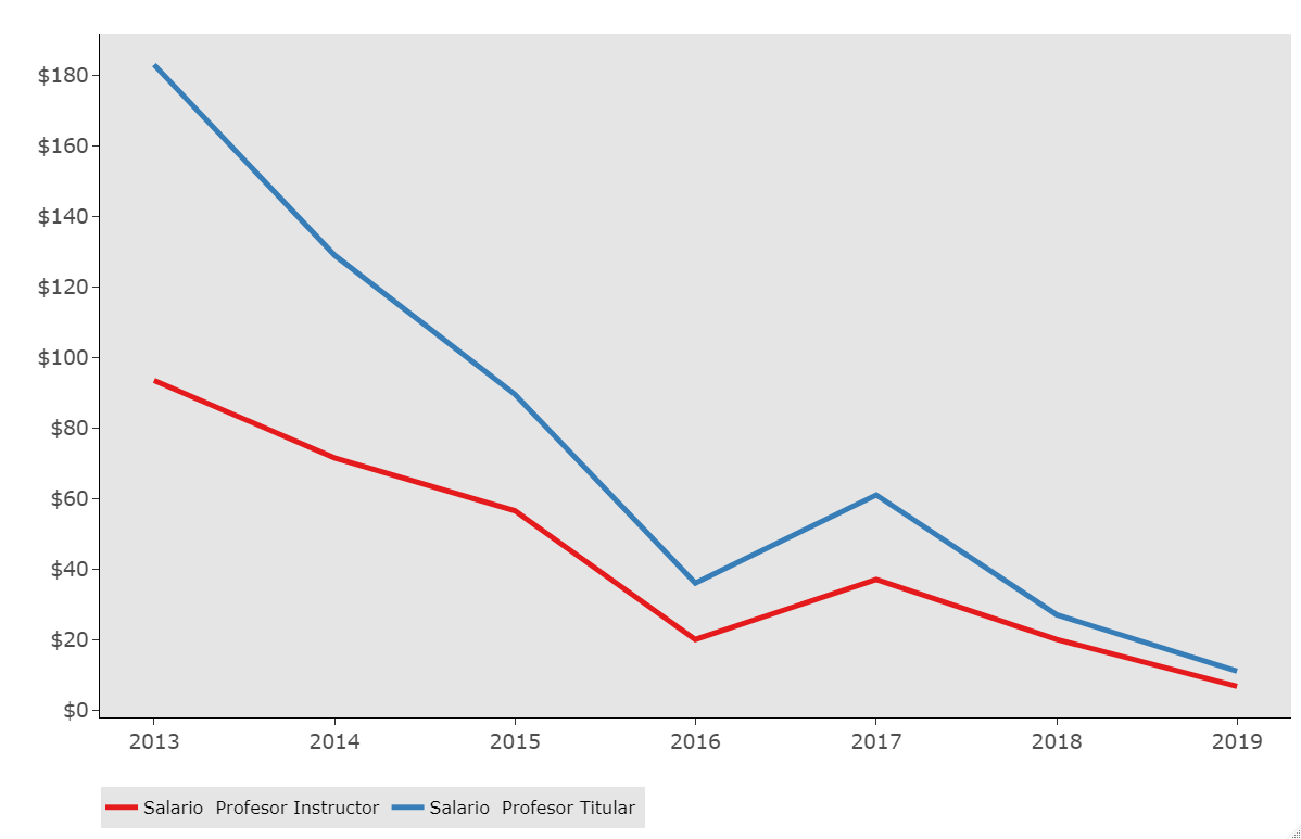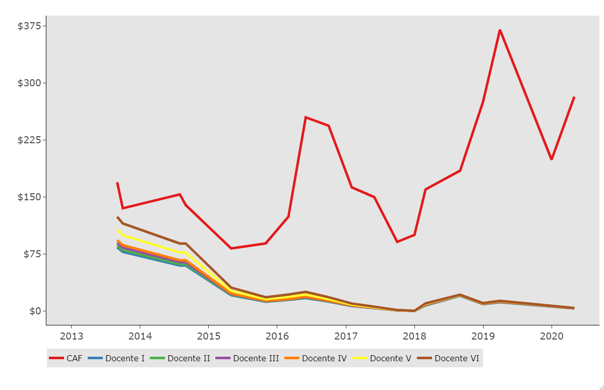 Educación: Gráficos Educación: Gráficos Usado en: Salario Docentes (40hrs) del Magisterio Venezolano Usado en: Salarios del Magisterio venezolano (40hrs.) vs. Canasta Alimentaria Familiar (CAF) Usado en: Salario del Profesor Universitario. Titulares e Instructores con dedicación exclusiva Compártelo: Compartir en X (Se abre en una ventana nueva) X Comparte en Facebook (Se abre en una ventana nueva) Facebook Me gusta Cargando...